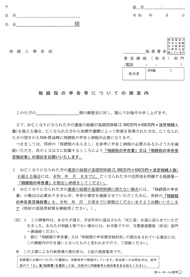 このお知らせは「税務署の計算では相続税がかかる可能性が高いので、相続税がかかるかどうか返事をしてください」というものです。