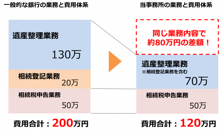 上記の通り、同じ遺産整理業務でも銀行の業務ですと200万円かかってしまうことになります。