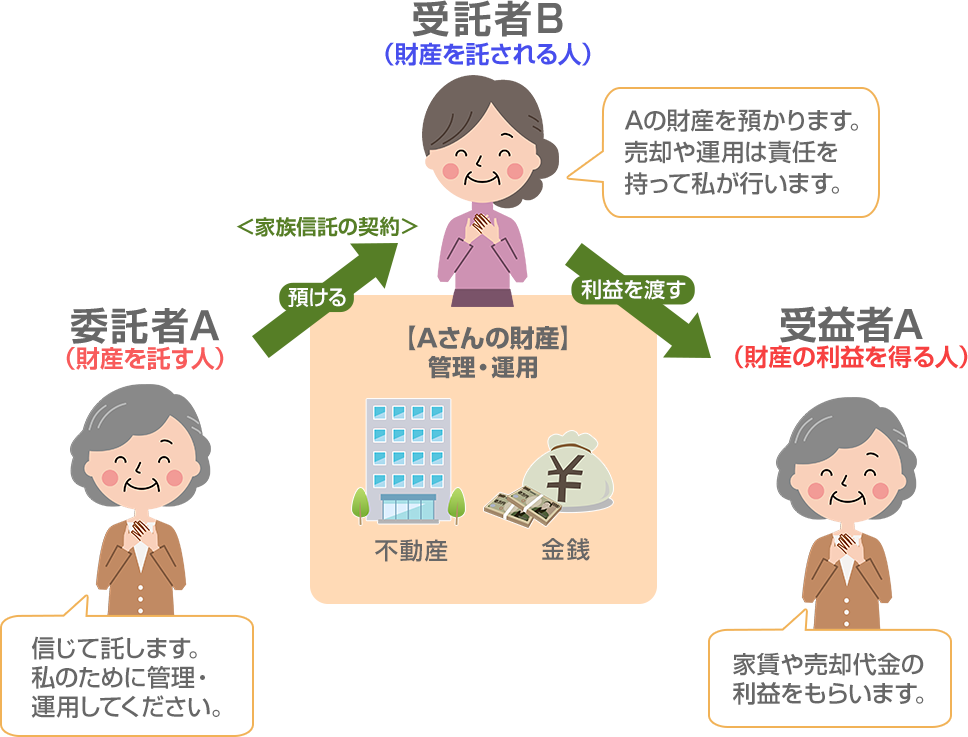 財産を信頼のできる家族に託し、自分や家族のために管理してもらうという財産の管理・処分の方法です。
